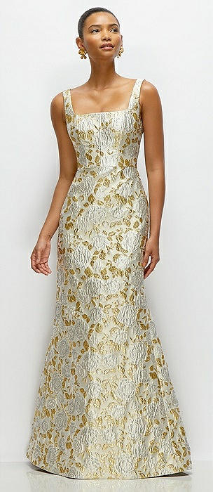 Champagne Floral Brocade Square Neck Maxi Dress with Trumpet Skirt in champagne filigree