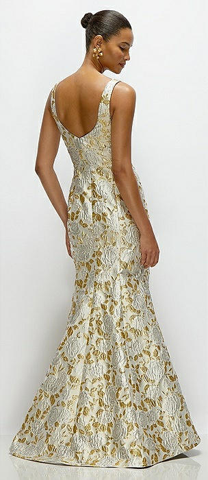 Gold Leaf Brocade Floral Square Neck Maxi Dress with Trumpet Skirt in winter rose