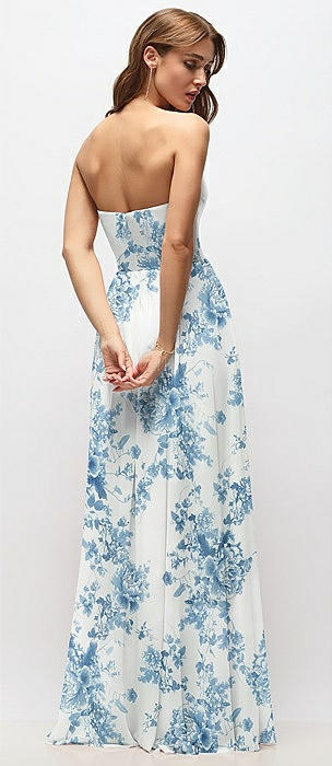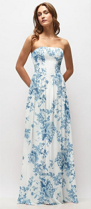 Strapless Basque Drop Waist Floral Chiffon Maxi Dress with Shirred Skirt in cottage rose dusk blue