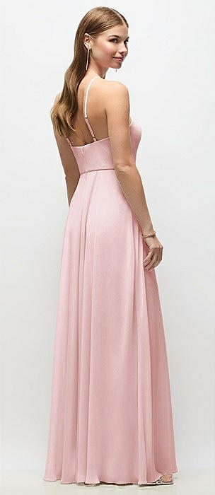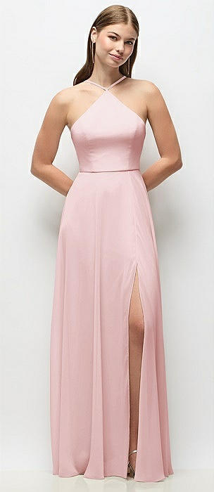 High-Neck Halter Chiffon Maxi Dress with Adjustable Spaghetti Straps in ballet pink