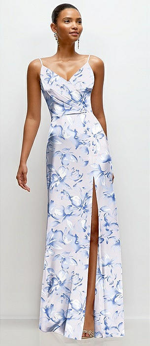Floral Pleated Faux Wrap Satin Maxi Dress with Adjustable Spaghetti Straps in magnolia sky
