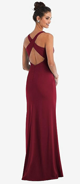 Stand Collar Halter Maxi Dress with Criss Cross Open-Back in burgundy
