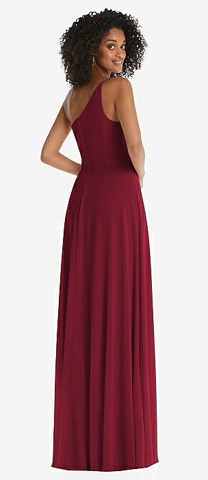 One-Shoulder Chiffon Maxi Dress with Shirred Front Slit in burgundy
