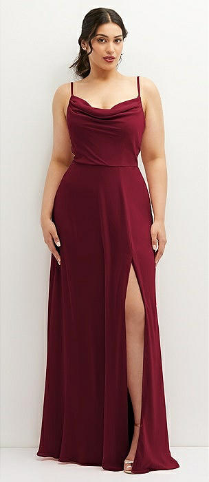 Cowl-Neck Wide Strap Crepe Trumpet Gown with Front Slit in burgundy