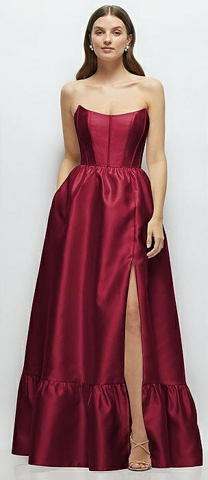 Strapless Cat-Eye Boned Bodice Maxi Dress with Ruffle Hem in burgundy