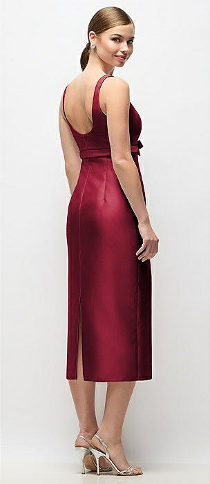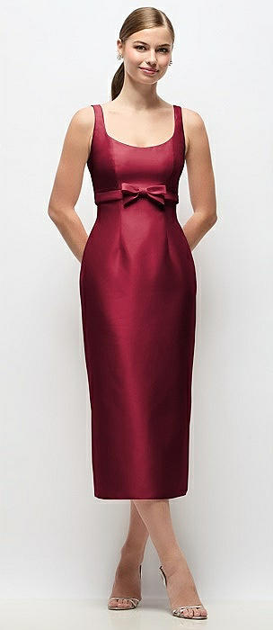 Scoop Neck Satin Column Midi Dress with Bow at Empire Waist in burgundy