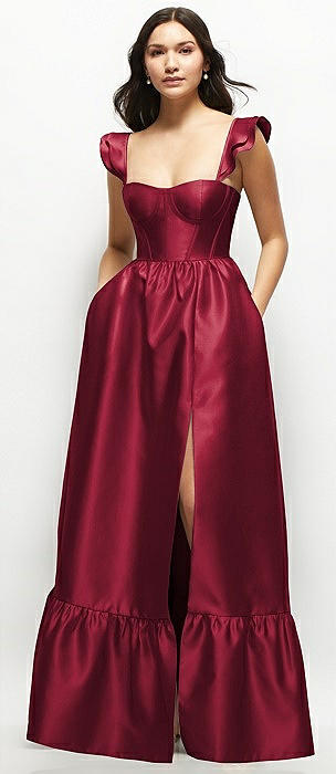 Satin Corset Maxi Dress with Ruffle Straps & Skirt in burgundy
