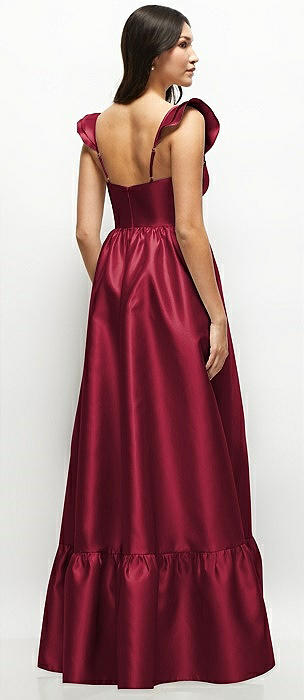 Bow-Shoulder Satin Maxi Dress with Asymmetrical Tiered Skirt in burgundy