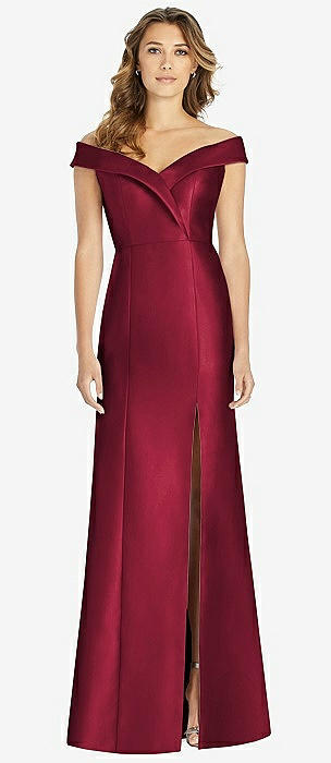 Off-the-Shoulder Cuff Trumpet Gown with Front Slit in burgundy
