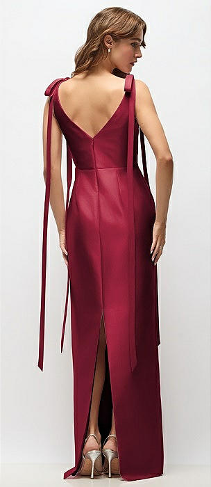 Bateau Neck Satin Column Maxi Dress with Exaggerated Tail Bow Straps in burgundy