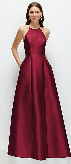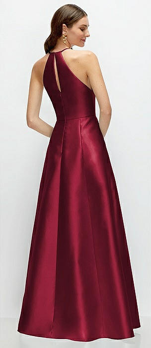 Jewel Neck Halter Full A-Line Satin Maxi Dress in burgundy