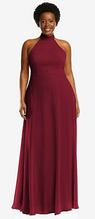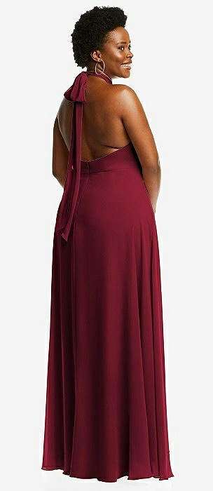 High-Neck Halter Open-Back Satin Trumpet Dress in burgundy