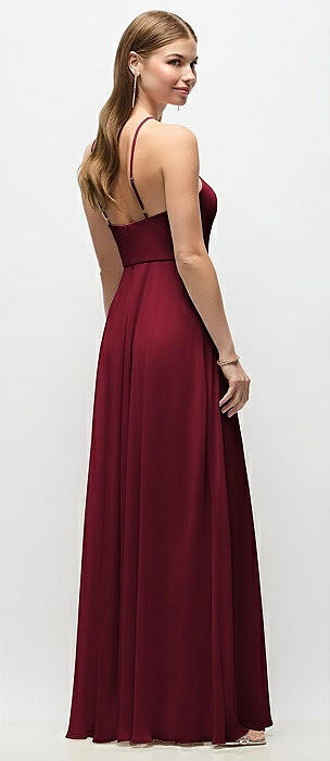 High-Neck Halter Chiffon Maxi Dress with Adjustable Spaghetti Straps in burgundy