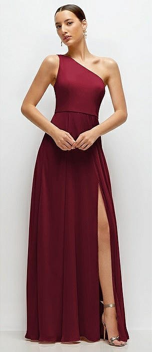 Chiffon One-Shoulder Maxi Dress with Circle Skirt in burgundy