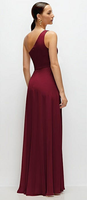 One-Shoulder Chiffon Maxi Dress with Shirred Front Slit in burgundy