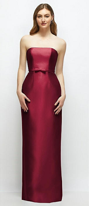 Strapless Satin Column Dress with Bow-Trimmed Skinny Belt in burgundy