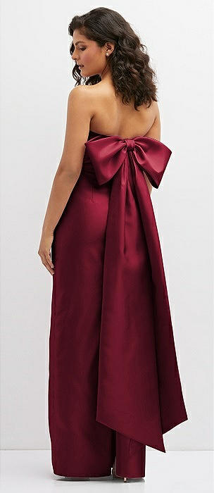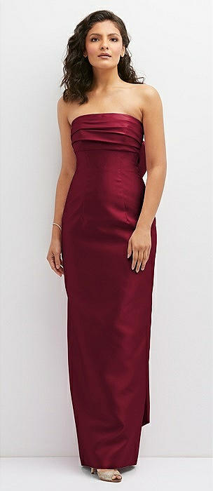 Strapless Draped Bodice Column Dress with Oversized Bow in burgundy