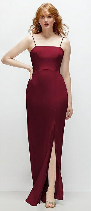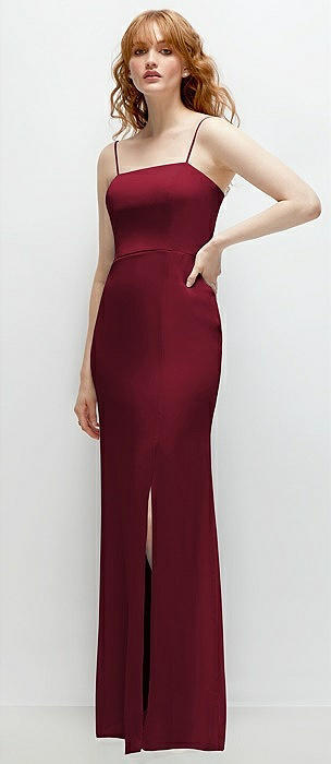 Cowl-Neck Wide Strap Crepe Trumpet Gown with Front Slit in burgundy