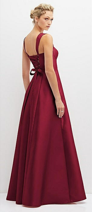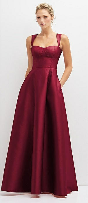 Lace-Up Back Bustier Satin Dress with Full Skirt and Pockets in burgundy