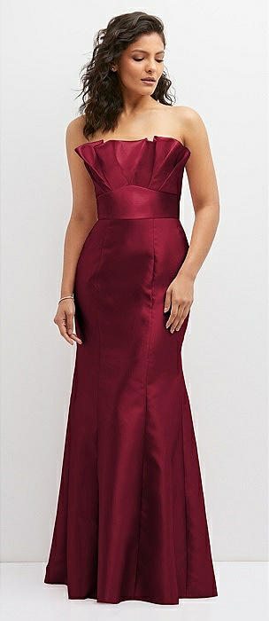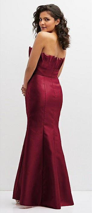 Strapless A-line Satin Gown with Modern Bow Detail in burgundy