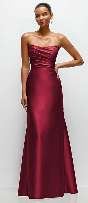 Strapless Cat-Eye Draped Bodice Satin Tumpet Dress in burgundy