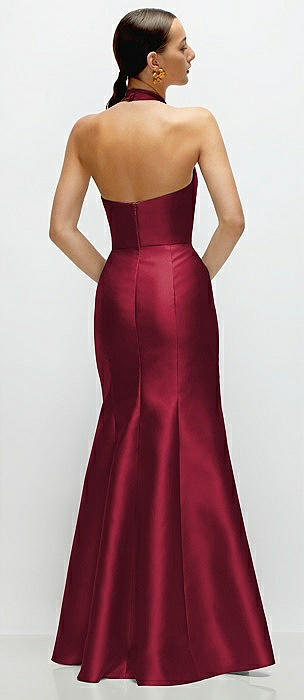 High-Neck Halter Open-Back Satin Trumpet Dress in burgundy