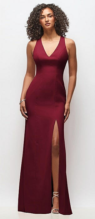 Notch Crepe Trumpet Gown with Front Slit in burgundy