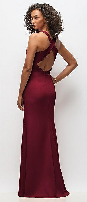 Off-the-Shoulder Criss Cross Back Trumpet Gown in burgundy