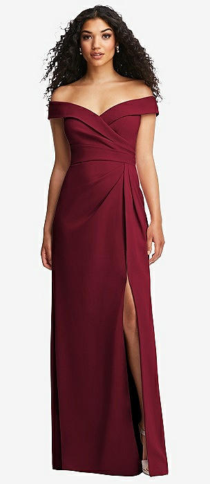 Cuffed Off-the-Shoulder Pleated Faux Wrap Maxi Dress in burgundy