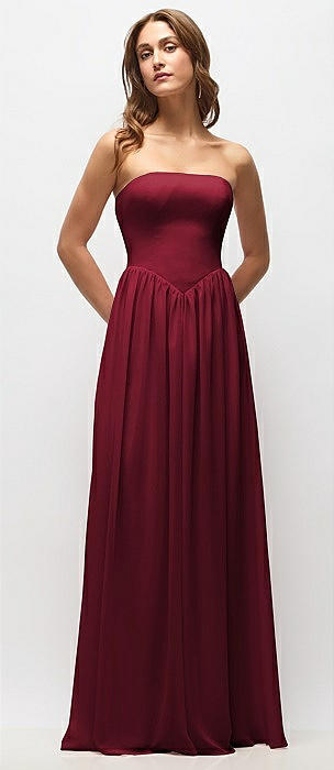 Strapless Basque Drop Waist Chiffon Maxi Dress with Shirred Skirt in burgundy