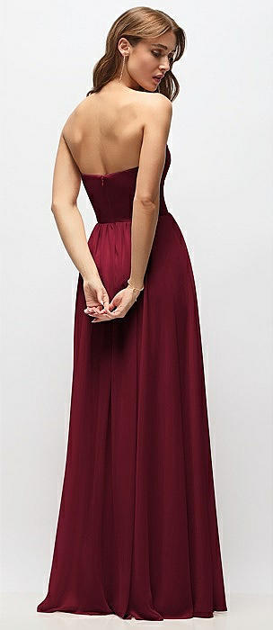 Strapless Pleated Surplice Chiffon Maxi Dress with A-Line Skirt in burgundy