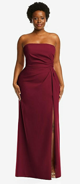 Strapless Pleated Faux Wrap Trumpet Gown with Front Slit in burgundy