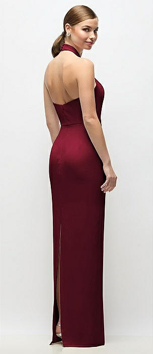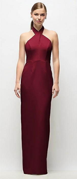 Criss-Cross Halter Open-Back Crepe Column Maxi Dress in burgundy