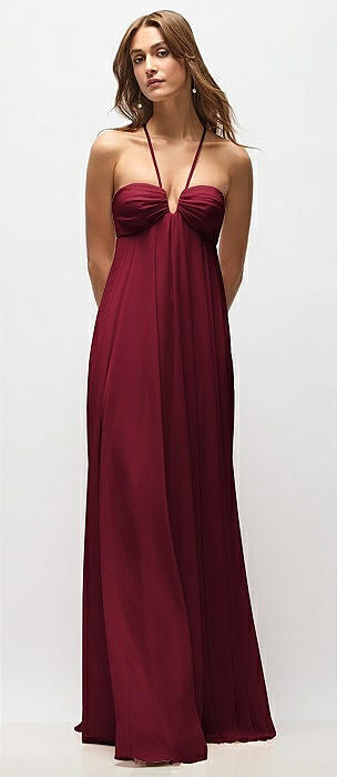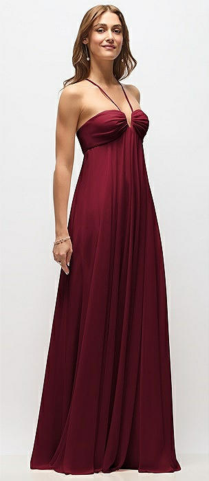 Empire Waist Chiffon Halter Maxi Dress with Convertible Spaghetti Straps in burgundy