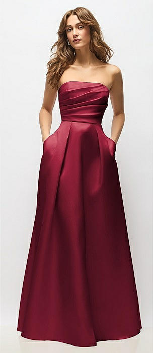 Strapless Bias Cuff Bodice Satin Gown with Pockets in burgundy