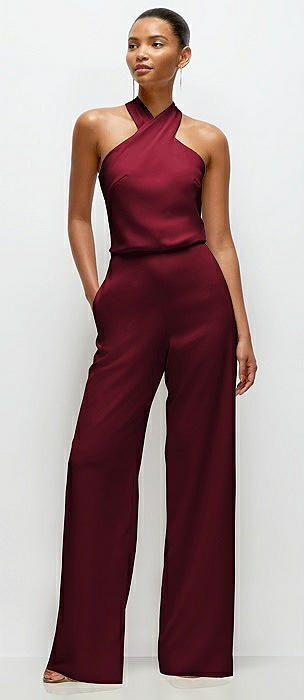 Pleated Halter Blouson Crepe Wedding Jumpsuit with Self-Tie Bow Back