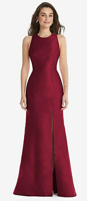 Jewel Neck Bowed Open-Back Trumpet Dress with Front Slit in burgundy