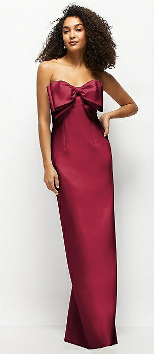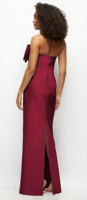 Strapless Satin Column Maxi Dress with Oversized Handcrafted Bow in burgundy