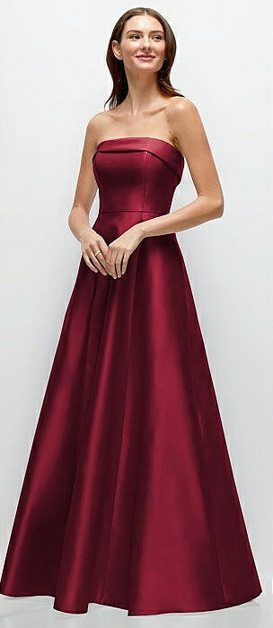 Strapless Bias Cuff Bodice Satin Gown with Pockets in burgundy