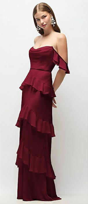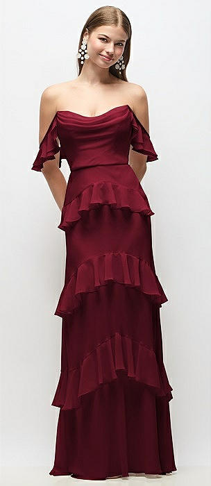 Off-the-Shoulder Cowl Chiffon Tiered Ruffle Maxi Dress with Convertible Ruffle Straps in burgundy