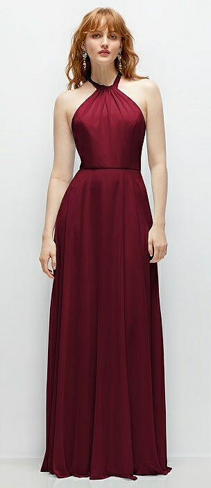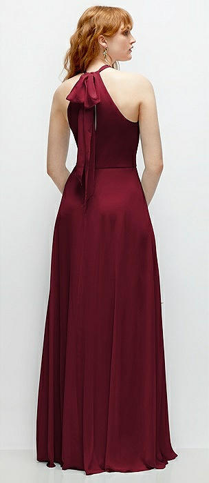 Shirred Halter Chiffon Maxi Dress with Back Sash-Tie Closure in burgundy