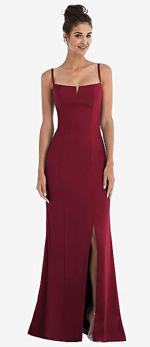 Notch Crepe Trumpet Gown with Front Slit in burgundy