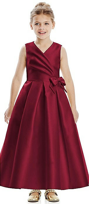 Faux Wrap Pleated Skirt Satin Twill Flower Girl Dress with Bow in burgundy