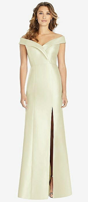 Off-the-Shoulder Cuff Trumpet Gown with Front Slit in butter yellow