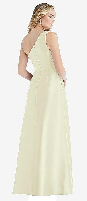 One-Shoulder Satin Gown with Draped Front Slit and Pockets in butter yellow