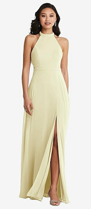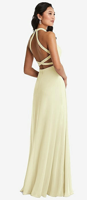 Stand Collar Halter Maxi Dress with Criss Cross Open-Back in butter yellow