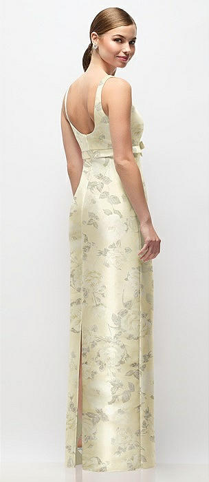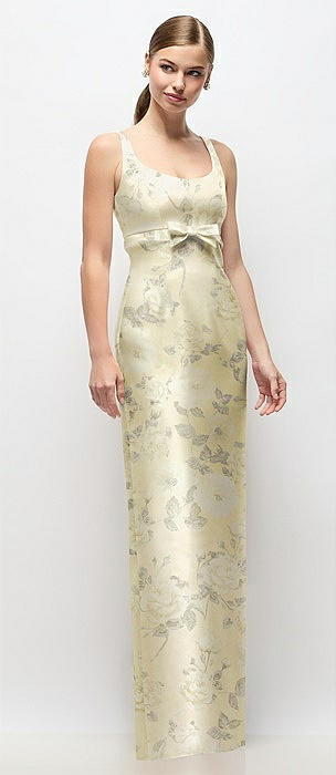 Scoop Neck Floral Satin Column Maxi Dress with Bow at Empire Waist in butter yellow floral
