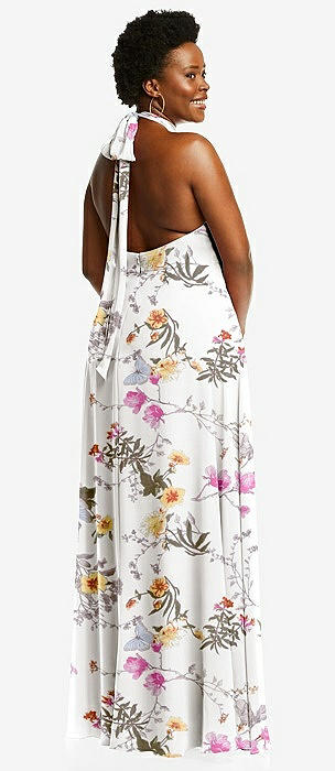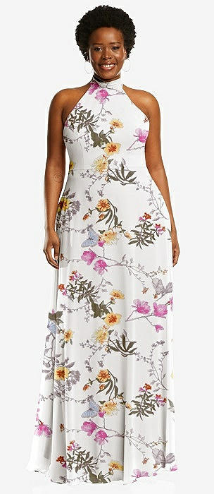High Neck Halter Backless Maxi Dress in butterfly botanica ivory
