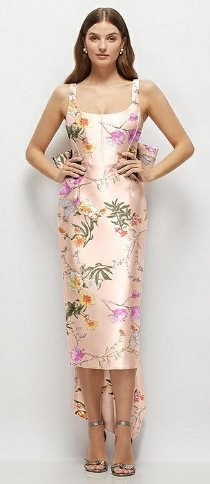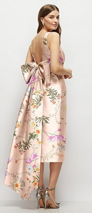 Floral Scoop Neck Corset Satin Midi Dress with Floor-Length Bow Tails in butterfly botanica pink sand