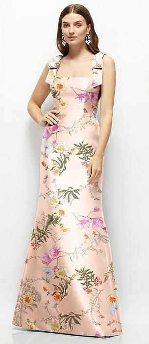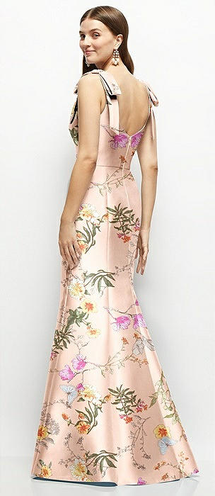 Deep V-back Floral Satin Trumpet Dress with One-Shoulder Cascading Bow in butterfly botanica pink sand
